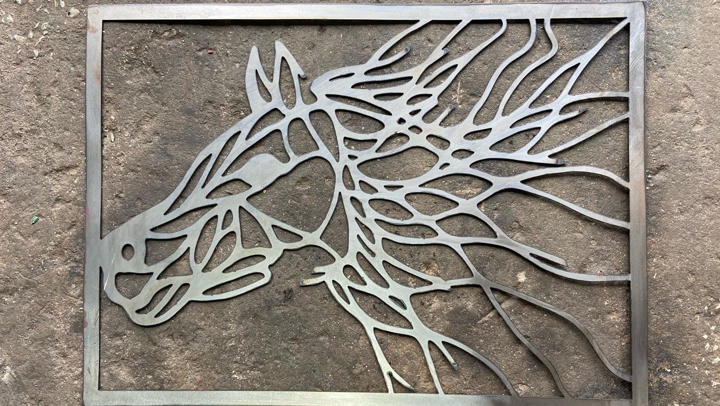 Sizing options: 18 - 36" wide, choose from 14 gauge stainless. This geometric horse hanging is perfect for the horse person in your life. If you'd like a custom size, contact us.